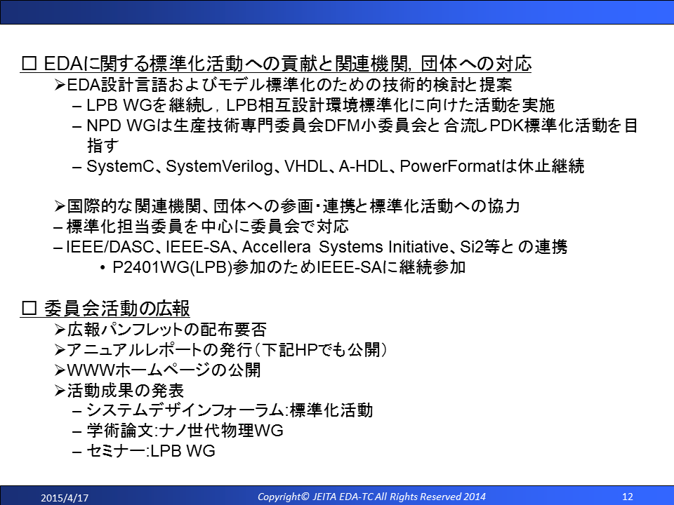このページではEDA技術専門委員会の概要及びその活動報告と本年度の活動計画がご覧いただけます。各コンテンツの詳細を表示するには「詳細を見る」ボタンをクリックしてください。内容が表示されます。 尚、前年度以前の活動実績に関してご覧になりたい方は、本サイトの「公開資料ライブラリ」ページに掲載しておりますので、こちらをご覧ください。